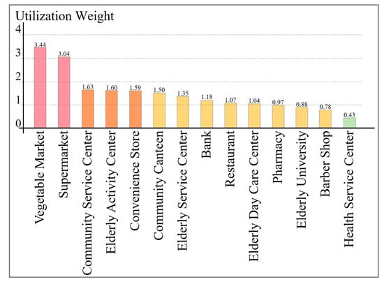 As shown in Figure 8, in terms of the utilization weight of various facilities, the vegetable market and supermarket score the highest, exceeding 3 points, and are the most frequently used facilities by the elderly, providing the most help for their daily lives. For the community service center (1.63), elderly activity center (1.60), and convenience stores (1.59), which are facilities that the elderly use quite a lot, the weight reaches more than half that of the previous two types of facilities. The health service center/community hospital has the lowest score (0.43), which is the only facility with a weight lower than 25% of the weight of the most commonly used facilities for the elderly.