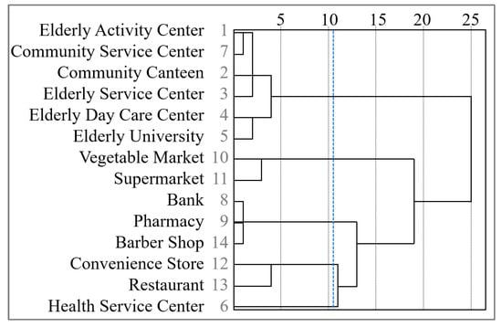 Based on the average utilization weight of each facility by the elderly, the percentage of users, and the percentage of each facility’s lack weight, cluster analysis was performed with the criterion of inter-group distance. As shown in Figure 10, the facilities can be divided into the following five types: (1) high-demand facilities, (2) high-frequency usage facilities, (3) low-frequency usage facilities, (4) high-frequency habitual facilities, and (5) low-frequency occasional facilities.