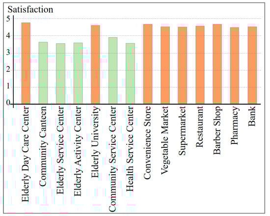 Specifically, the scores for the elderly day care centers and the elderly universities are relatively high, indicating that the services provided by these facilities are good. For other facilities, many elderly people believe that the facilities do not truly care about their real needs, and the service level of the facilities is limited. It should be noticed that although the elderly university has a relatively high satisfaction rate, according to the research in the previous sections, the utilization weight and demand weight of this facility are both ranked relatively low among all facilities. For commercial service facilities, the elderly are generally satisfied because they are familiar with the surrounding commercial facilities and find them convenient to use, with only a few dissatisfied responses.