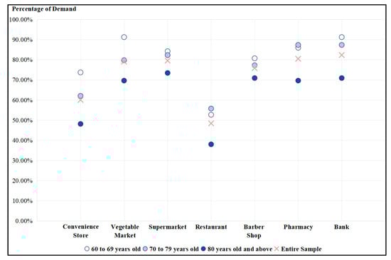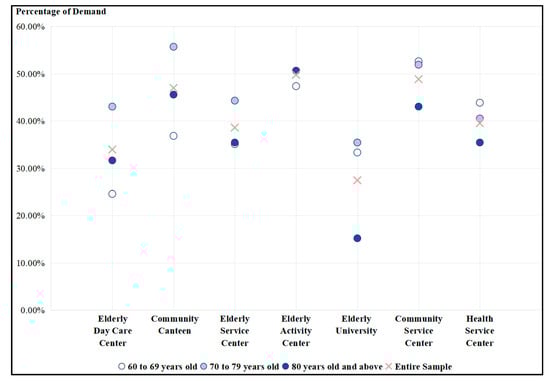 As shown in Table 2, elderly individuals from all age groups have a relatively low demand for elderly day care centers and elderly universities among the index service facilities. The facilities with higher demand are elderly activity centers, community service centers, and community canteens. For all elderly people, the facility with the highest demand is the elderly activity center, followed by the community service center. The facilities with the lowest demand are the elderly university, followed by the elderly day care centers. This characteristic is consistent with the needs of elderly people over 70 years of age.