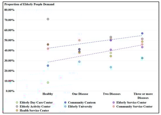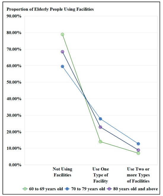 Younger elderly people have a lower demand for elderly day care centers, which is related to the higher self-care ability of the younger elderly, and they do not need to use the relevant facilities. Middle-aged elderly people have a higher demand for community restaurants/elderly canteens, and the older elderly have a higher demand for elderly activity centers. These characteristics clearly relate to the decline in the physical function of the elderly. As middle-aged elderly people experience a gradual decline in physical function, the intensity of cooking (including buying, cooking, cleaning, throwing away garbage, and so on) by themselves will gradually increase, so the likelihood of eating out will also rise. However, as age further increases, the intensity of physical activity required for going out will also gradually increase, so the desire to eat out will gradually decrease. Conversely, participating in activities at the activity center is more suitable for the elderly’s needs for outdoor exercise/activities (although most activities at the elderly activity center are still mainly seated). Overall, as age increases, the use of facilities among the elderly initially tends toward independent activities (ages 60–69) and gradually shifts to a greater need for community services (ages 70–79). As age further increases, the elderly are more and more inclined to choose more static activity facilities.