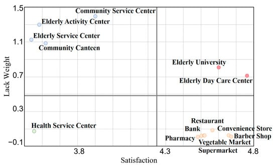 In analyzing the lack weight of facilities, the most severe shortages are found to be the community service center, elderly activity center, elderly service center, and community canteen/elderly restaurant, with scores all exceeding 1.0 point. These shortages are significantly higher than those for other facilities and indicate the greatest need for improvement (as shown in Figure 9). The facilities that are comparatively lacking are the elderly university and the elderly day care center, with scores of around 0.7 to 0.8. The remaining facilities all score below 0.1 points, indicating that there is basically no shortage in the current situation.