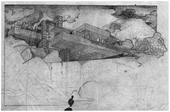 - Wright, F.L. Project 3602: Edgar J. and Liliane Kaufmann house (Mill Run, Pennsylvania), Fallingwater, View from below. Repository: Avery Architectural & Fine Arts Library, Columbia University Avery Drawings & Archives Frank Lloyd Wright Foundation Archives: Architectural drawings, 1885–1959 Series VI: 1930s, New York. Available online: https://www.jstor.org/stable/community.36562339 (accessed on 8 May 2024).