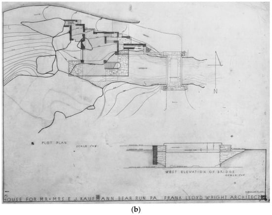 (a) Stairs of Fallingwater—view from southwest of steps and bridge over the stream. Reproduced with permission from from Ref. []; (b) Kaufmann House, Fallingwater on Bear Run, Pennsylvania, 1935–1937, “plot plan” showing main floor bearing walls. Reproduced with permission from Ref. [].