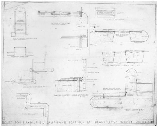 - Wright, F.L. Project 3602: Edgar J. and Liliane Kaufmann house (Mill Run, Pennsylvania), Fallingwater, Working drawings. Repository: Avery Architectural & Fine Arts Library, Columbia University Avery Drawings & Archives Frank Lloyd Wright Foundation Archives: Architectural drawings, 1885–1959 Series VI: 1930s, New York. Available online: https://www.jstor.org/stable/community.36562399 (accessed on 8 May 2024).