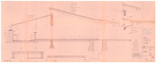 The Boa Nova Tea House (Siza, 1958–1963) is based on the use of traditional architectural elements such as wood carpentry and wood ceilings, along with innovative materials like reinforced and cyclopean concrete and copper. Siza employs reinforced concrete for the foundations, entrance slab, and exterior walls (Figure 7). The entire surrounding area, as well as the basement, is supported directly on the rocks or cyclopean concrete walls. The building’s pitched roofs are formed by a structure of reinforced concrete and brick slabs. The exterior cladding is Roman ceramic tile, placed over concrete beams anchored to the slabs. These beams have small openings to drain rainwater. Copper is used in the gutters and roof coverings. The interior walls, made of stone or brick, rest on reinforced concrete foundations, plastered and painted white. Afzelia wood is used in ceilings, interior floors, and carpentry [].