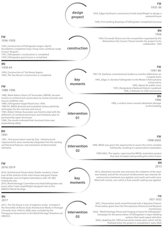 The choice of the works of Frank Lloyd Wright and Álvaro Siza Vieira intends to highlight the distinctiveness of their creations (Fallingwater and the Boa Nova Tea House) (Figure 1), their relation and proximity with water, and their underlying outstanding universal value (OUV). Fallingwater is included in the serial nomination “20th Century Architecture of Frank Lloyd Wright”, which was inscribed in 2019, and it was the first inscription of a modern building in UNESCO World Heritage for USA. The Tea House is part of the UNESCO nomination “Ensemble of Álvaro Siza’s Architecture Works in Portugal”, listed as a tentative candidate since 2017, and it could be the first inscription of a modern building in Portugal.