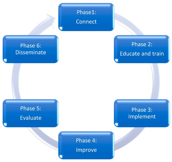 The working methodology or pathway for establishing all LLs consisted of six operational phases: Phase 1: Connect, Phase 2: Educate and Train, Phase 3: Implement, Phase 4: Improve, Phase 5: Evaluate, and Phase 6: Disseminate, as seen in Figure 1.