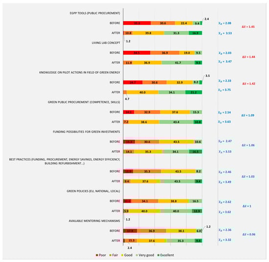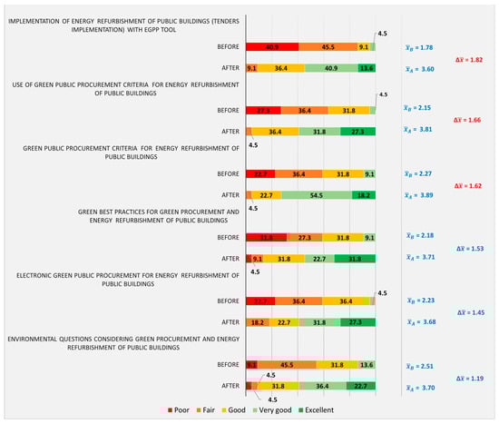 As illustrated in Figure 6 (the right part indicating average values ( and differences (), the lowest level of knowledge before participating in the LLs was observed for the topic of “Implementation of energy refurbishment of public buildings (tenders’ implementation) , while the highest level of knowledge was noted for “Environmental questions considering green procurement and energy refurbishment of public buildings” ). This indicates that stakeholders generally had a lower initial knowledge regarding the practical implementation of energy refurbishment projects using specific tools, compared to environmental considerations. After participating in LLs, the highest level of knowledge was observed for the topic of “Green public procurement criteria for energy refurbishment of public buildings” . In relative terms, knowledge levels improved significantly across all areas, with the highest relative improvement being observed for the field of “Implementation of energy refurbishment of public buildings with eGPP tool” (, followed by “Use of green public procurement criteria for energy refurbishment of public buildings” ( and “Green public procurement criteria for energy refurbishment of public buildings” (. This demonstrates a substantial increase in stakeholders’ knowledge after participating in LLs, particularly in the practical aspects of green public procurement and energy refurbishment projects.