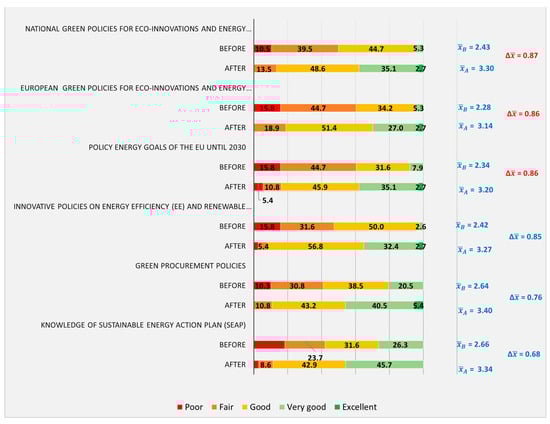 As illustrated in Figure 3 (the right part indicating average values ( and differences (), the lowest level of knowledge before participating in the LLs was observed for the topic of “European green policies for eco-innovations and energy refurbishment of buildings”, while the highest level of knowledge was noted for “Knowledge of Sustainable Energy Action Plan (SEAP)” . This indicates that stakeholders generally had a lower initial understanding of European green policies compared to their knowledge of the SEAP. After participating in LLs, the highest level of knowledge was observed for the topic of “Green procurement policies” (. In relative terms, knowledge levels improved across all areas, with the highest relative improvement being observed in the field of “National green policies for eco-innovations and energy refurbishment of buildings” ( followed by “European green policies for eco-innovations and energy refurbishment of buildings” ( and “Policy energy goals of the EU until 2020 and 2030” (. This demonstrates a significant increase in stakeholders’ knowledge after participating in LLs, particularly in understanding national green policies and the EU’s energy goals for the coming decades.