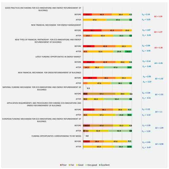 As illustrated in Figure 4 (the right part indicating average values ( and differences (), the lowest level of knowledge before participating in the LLs was observed for the topic of “New financial mechanism for energy management” , while the highest level of knowledge was noted for “Funding opportunities corresponding to my needs” This indicates that stakeholders generally had a lower initial understanding of new financial mechanisms specifically tailored for energy management compared to general funding opportunities that align with their needs. After participating in LLs, the highest level of knowledge was observed for the topic of “Good practices on funding for eco-innovations and energy refurbishment of buildings” (. In relative terms, knowledge levels improved significantly across all areas, with the highest relative improvement being observed for the field of “Good practices on funding for eco-innovations and energy refurbishment of buildings”(, followed by “New financial mechanism for energy management” ( and “New types of financial partnership” (. This demonstrates a substantial increase in stakeholders’ knowledge after participating in LLs, particularly in understanding new financial mechanisms and best practices for funding eco-innovations and energy refurbishment projects.