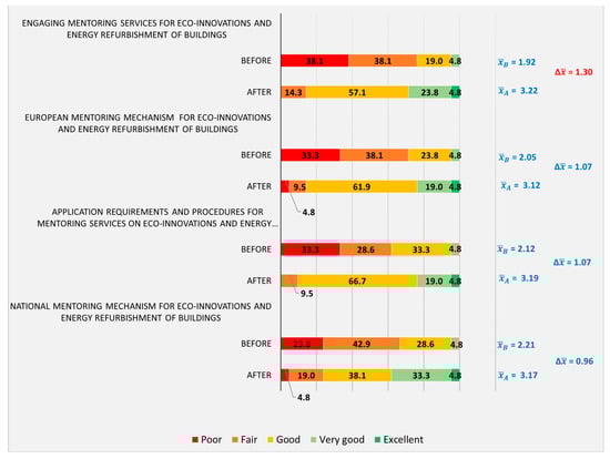 As illustrated in Figure 5 (the right part indicating average values ( and differences (), the lowest level of knowledge before participating in the LLs was observed for the topic of “Engaging mentoring services for eco-innovations and energy refurbishment of buildings” , while the highest level of knowledge was noted for “National mentoring mechanism for eco-innovations and energy refurbishment of buildings” . This indicates that stakeholders generally had a lower initial understanding of how to engage mentoring services specifically tailored for eco-innovations and energy refurbishment compared to national mechanisms for mentoring. After participating in LLs, the highest level of knowledge was observed for the topic of “Engaging mentoring services for eco-innovations and energy refurbishment of buildings” (. In relative terms, knowledge levels improved significantly across all areas, with the highest relative improvement being observed for the field of “Engaging mentoring services for eco-innovations and energy refurbishment of buildings” (, followed by “European mentoring mechanism for eco-innovations and energy refurbishment of buildings” and “Application requirements and procedures for mentoring services on eco-innovations and energy refurbishment of buildings” . This demonstrates a substantial increase in stakeholders’ knowledge after participating in LLs, particularly in understanding how to engage mentoring services for eco-innovations and energy refurbishment projects.