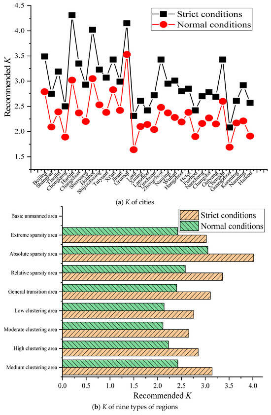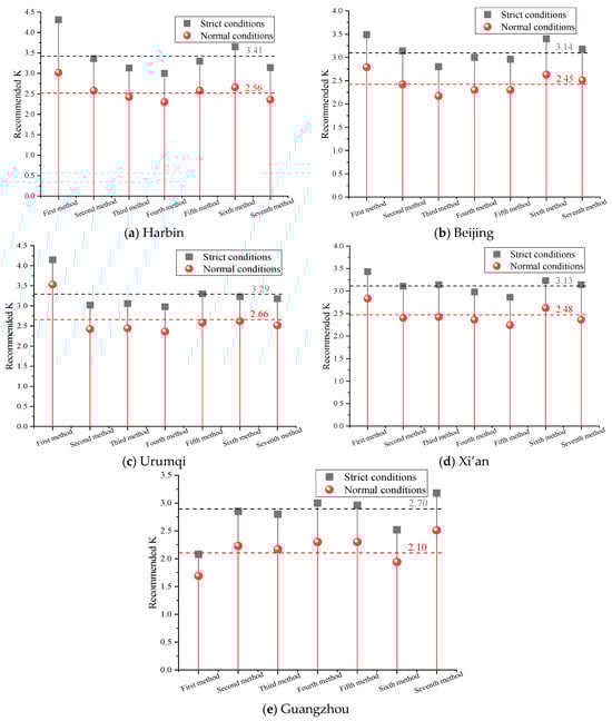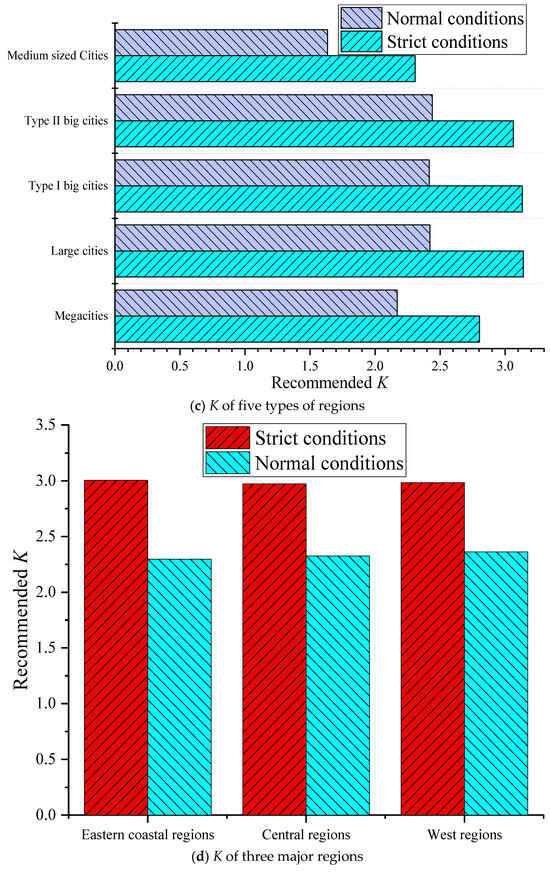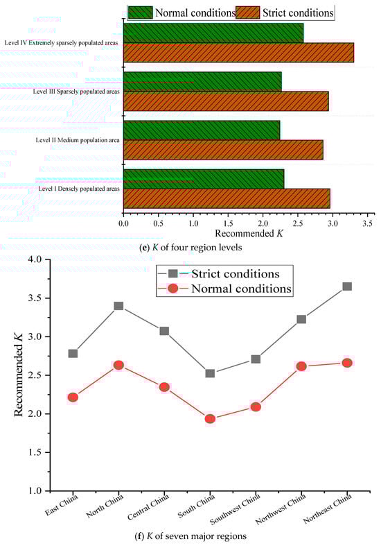 - There are significant differences in the recommended K values for different population density zones; the recommended K values for all seven population density zones meet the K value requirements of the region. The average value of five typical cities under strict conditions is 3.14, and the average value under normal conditions is 2.45;