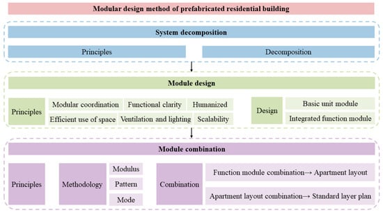 The research route of this study is shown in Figure 1. The design method is utilized by taking the prefabricated residential building as an example. The implementation of the modular design methodology is applied as an example with a model of a residential building within 54 m. Since modular design is more advantageous in mass production [27], the application is mainly demonstrated for apartment-type houses or two- to three-bedroom houses with greater demand. It is important to note that the application of the design method proposed in this study is not limited to these cases.