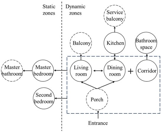 After the system is decomposed and the typical module design of the subsystem is carried out, a new system is formed by combining the modules in the module library. Reasonable zoning of different functional spaces in the form of regionalization can improve the use efficiency of indoor space and the quality of living in a limited area. Generally speaking, the functional partition of the set mainly includes public and private partitions, dynamic and static partitions, and clean and dirt partitions. Figure 2 shows the relationship between the three major partitions and sorts out the relative position relationship of each functional module in the house type.