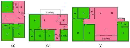 Horizontal hall floor plan: (a) Large-depth 2-BU pattern; (b) Large-width 3.5-BU pattern; (c) Large-width 4.5-BU pattern (B: Bedroom; D: Dining room; K: Kitchen; L: Living room; P: Porch; W: Bathroom).