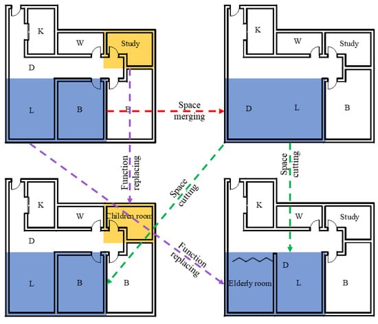 In this study, mode refers to the state change that may occur in the residential spatial layout in time. The time dimension is introduced into the evaluation system of residential units, which requires the house design to pay attention to the different states in the whole life cycle of the house and provide flexible response schemes. The point of studying modality is to leave enough flexibility in the house design to accommodate future uses. The research method can draw on the attitude of “everyday urbanism”, focus on specific activities and existing situations in daily life, and solve social life problems from the perspective of ordinary users. Strategies to solve problems usually include: (i) merging modular spaces to create a large space that can be used flexibly; (ii) cutting within modular spaces to create new enclosed rooms to accommodate some new functions; and (iii) replacing the functions of equal spaces to more rationally configure and use functions to cope with changes in daily life.
