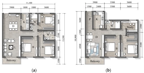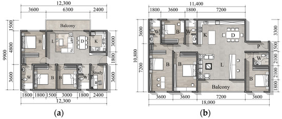 Typical plans of 3-BU (unit: mm): (a) Apartment layout B1; (b) Apartment layout B2.