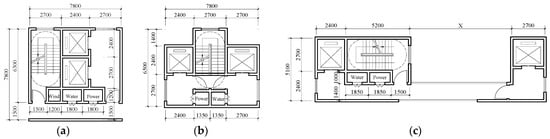 Typical plans of 2-BU (unit: mm): (a) Apartment layout A1; (b) Apartment layout A2; (c) Apartment layout A3.