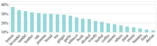 To extract the types of odors that characterize the living environment in China, an investigation of the olfactory environment within living spaces was conducted using offline questionnaires. The details are shown in Appendix A.1. In total, there were 325 valid responses, the questionnaire covered odors that are commonly found in living spaces, and the details are shown in Figure 1. Using the research findings as a basis, lemon [36.92%], lavender [33.53%], sandal [32.61%], jasmine [29.84%], leather [31.38%] and ink [30.15%] were identified that exhibited a high occurrence rate, and they were subsequently selected as the odor types for an online survey that focused on odor preference.