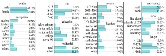Regarding occupations, they were categorized as student, teacher, chef, doctor, laborer, farmer, lawyer, retiree, and other, according to China’s National Occupational Qualification Management Database [31]. In terms of geographic attributes, the geographic locations were classified into seven regions based on China’s regional divisions [32], specifically Northeast China (encompassing Liaoning, Jilin, and Heilongjiang), East China (Shandong, Jiangsu, Anhui, Zhejiang, Fujian, and Shanghai), North China (Beijing, Tianjin, Hebei, Shanxi, and Neimenggu), Central China (Hubei, Hunan, Henan, and Jiangxi), South China (Guangdong, Guangxi, and Hainan), Southwest China (Sichuan, Yunnan, Guizhou, Xizang, and Chongqing), Northwest China (Ningxia, Xinjiang, Qinghai, Shanxi, and Gansu), and other (Taiwan, Hong Kong, and Macao) regions.