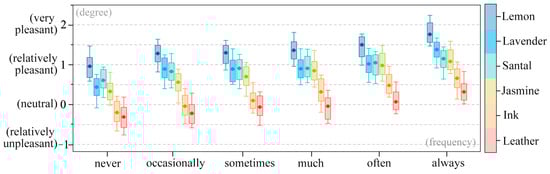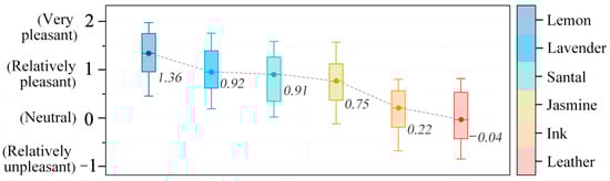 Figure 3 illustrates the acceptability levels of the odors that were commonly encountered in living spaces, as reported by the respondents, in the descending order of lemon (1.36), lavender (0.92), sandalwood (0.91), jasmine (0.75), ink (0.22), and leather (−0.04). This revealed a significant preference profile, with lemon, lavender, sandal, and jasmine being characterized as natural odors and exhibiting significantly higher acceptability levels than ink and leather, which were categorized as artificial odors. This was consistent with the findings of Yeshurun [33].
