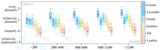 As shown in Figure 6, the trend of odor preference was consistent among the different income groups. However, the individuals in the higher income groups exhibited a greater degree of odor preference. Nevertheless, there was no significant trend in lavender preference across the income groups. This is probably due to several factors. Jasmine odor is often regarded as soothing and stress-relieving, making it more appealing to higher income groups [41]. Lemon odor is associated with cleanliness, freshness, and a high-class image, which aligns with the quality of life that is pursued by those with higher incomes. Additionally, individuals in higher income groups may have a greater appreciation for the spiritual and cultural aspects that are associated with the sandalwood, ink, and leather scents, and therefore may have a higher preference for them.