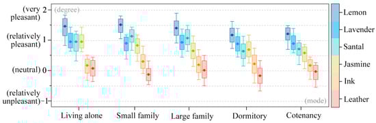 As depicted in Figure 8, people with different living patterns conformed to the same trend of odor preference, and the differences were mainly reflected in the degree of preference. There was a higher odor preference for people with relatively simple life patterns. Specifically, for the jasmine, lemon, and lavender odors, people living alone, with a small family, or with a large family exhibited significantly higher odor preferences when compared with those residing in a dormitory or cotenancy. There was no significant impact on odor preference for the lavender, leather, and ink odors across the different living modes. This could be explained by the fact that dormitories and cotenancies may limit the subjects’ odor preferences due to a smaller personal living space, limited use of household equipment and supplies, and more complexity and variability in the people than in a mixed household.