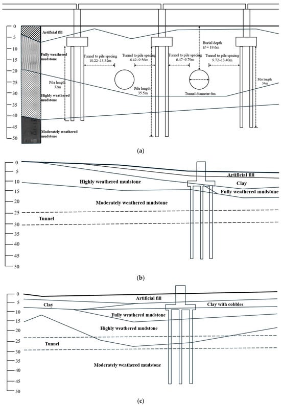 Tunnel cross-section and geological profile along the route: (a) tunnel geological cross-section; (b) left line tunnel geological cross-section; (c) right line tunnel geological cross-section.