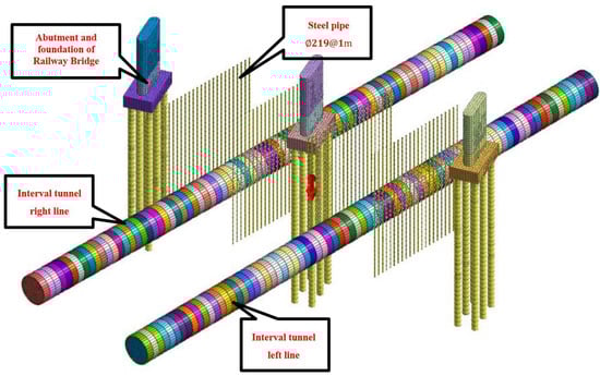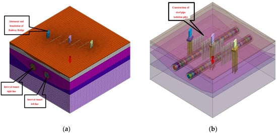 Lateral restrictions were imposed on the front, rear, and side boundaries of the model, while vertical restrictions were applied to the bottom boundary. The ground surface was set to be free within the model. Soil layers, tunnel linings, and other structures in the model were simulated using elastic–plastic solid elements that follow the Mohr–Coulomb criterion. Pile foundations and steel pipe isolation piles were simulated using beam elements, with interface elements added to effectively simulate the interaction between the piles and the surrounding soil. The 3D model and its relative positions are presented in Figure 3.