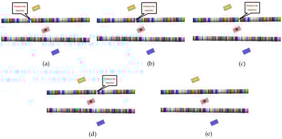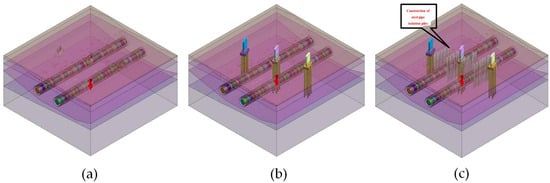 The numerical model thoroughly portrayed the shield tunnelling procedure from initiation to completion. The main process of numerical simulation model construction is shown in Figure 4. Firstly, Figure 4a indicates the initial condition, in which the tunnel structure is not activated; Figure 4b indicates the addition of the bridge pile structure; Figure 4c indicates the addition of the added tunnel isolation piles. The shield construction process for the right and left lines are shown in Figure 5 and Figure 6, respectively. Each line contains five construction phases: tunneling towards the bridge piles; shield head approaching the bridge piles; shield traversing the bridge piles; shield tail dragging out of the bridge pile influence area; and shield safely traversing and driving away from the bridge pile influence area. It precisely captured the deformation of the railway at different stages of construction by focusing on the deformations before and after shield interval passing underneath the existing railway, as depicted in Figure 4, Figure 5 and Figure 6.