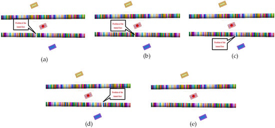 For the right line of the interval: (a) excavation advances to starting point of isolation piles; (b) excavation advances to the nearest point of the bridge foundation; (c) excavation underneath the bridge; (d) excavation advances to ending point of isolation piles; (e) completion of the construction.