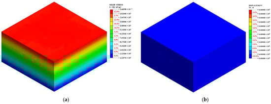 To obtain the initial state of the soil before the tunnel construction at the intersection section, and to reset the existing structural displacements, preparation was made for subsequent construction simulations. The stress and displacement nephograms in the initial state are shown in Figure 7.