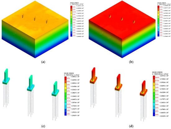 The distributions of structural and principal stresses within the bridge were obtained by performing simulations of the construction stages of bridge piers and pile foundations, which are illustrated in Figure 8.