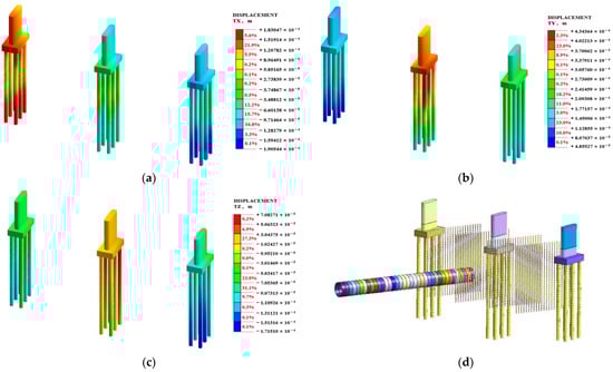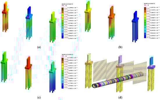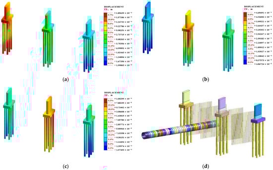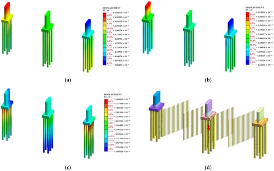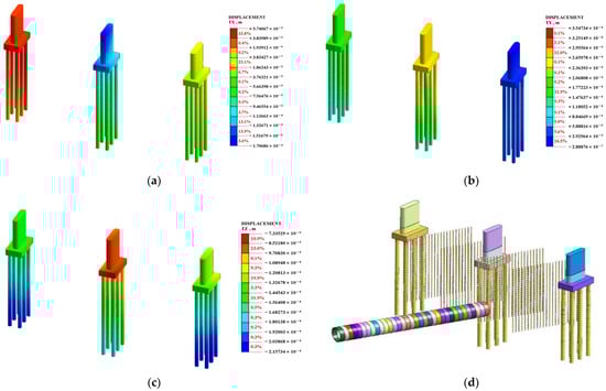 Displacement nephograms of the bridge resulting from the installation of steel pipe isolation piles, as well as a schematic diagram of the installation of steel pipe isolation piles: (a) horizontal displacement; (b) longitudinal displacement; (c) vertical displacement; (d) schematic diagram of the installation of steel pipe isolation piles.