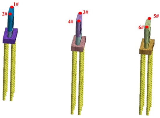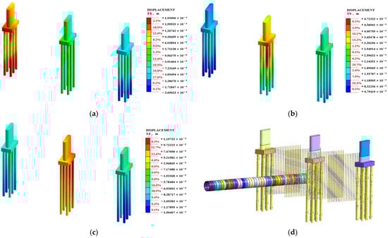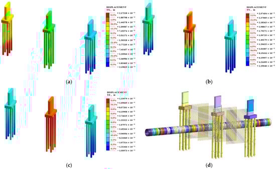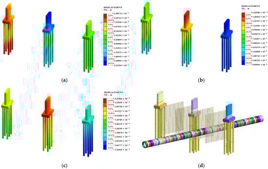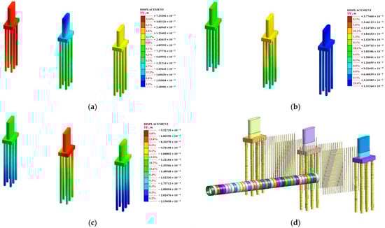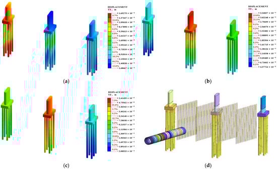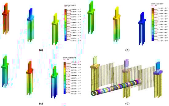 Steel pipe isolation piles with a diameter of 219 mm and a spacing of 1 m were strategically installed beneath the bridge to assess the impact of isolation pile reinforcement construction on the deformation of railway bridge. The displacement nephograms of the railway bridge and the schematic diagram of the installation of steel pipe isolation piles are presented in Figure 9.