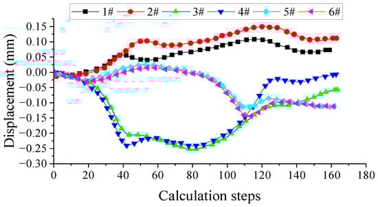 According to Figure 16, during the construction of the left line underneath the main bridge, the bridge experienced maximum horizontal and longitudinal displacements of 0.43 mm, which were mainly concentrated at the central bridge abutment. The bridge’s principal vertical deflection reached −0.17 mm, which was predominantly due to the vertical subsidence of its foundation.