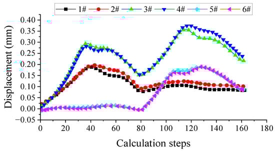 Figure 10 reveals that there were maximum horizontal and vertical displacements of 0.35 mm at the middle abutment when the right line of the interval was excavated to the starting point of steel pipe isolation piles. There was a downward displacement of 0.22 mm exhibited by the bridge, which was primarily attributed to the settling of the bridge’s foundation.