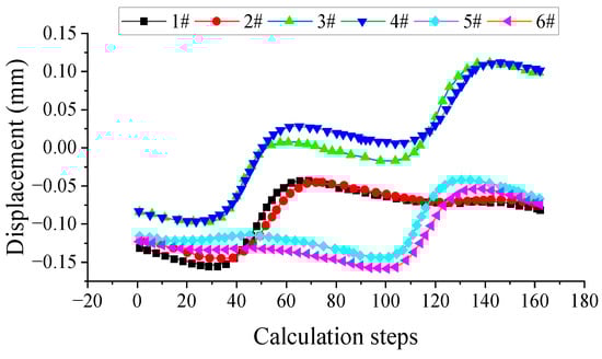 As depicted in Figure 12, when the right line of the interval was excavated beneath the bridge, the bridge experienced maximum horizontal and longitudinal displacements of 0.36 mm, primarily concentrated at the central bridge abutment. The maximum vertical displacement of the bridge foundation was −0.22 mm, indicating significant vertical settlement of the bridge foundation.