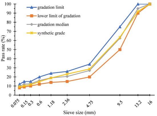 Mixture performance depends significantly on gradation types. Gap-graded asphalt mixtures are characterized by high proportions of coarse materials, mineral powder, asphalt binder, and a low proportion of fine aggregates. Such a mixture type has higher surface structure depth and, therefore, better skid resistance. SMA is a typical application of such mixture types and is the most commonly used mixture in the surface layer of high-level highways in Shanghai, China. In this study, SMA-13 mixtures were used, i.e., the maximum aggregate size was about 13.2 mm. The target gradation and actual gradation are shown in Table 7 and Figure 3.