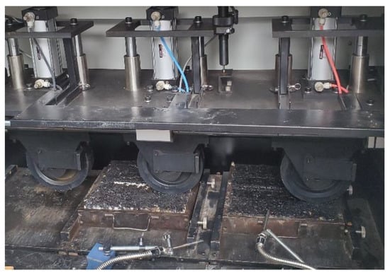 The rutting test is a simple and effective test method to evaluate the anti-rutting ability of the asphalt mixture. It is specified by simulating the repeated action of traffic load on the pavement. The test is based on Highway Engineering Asphalt and Asphalt Mixture Test Procedures (JTG E20-2011). In this study, the T 0719-2011 asphalt mixture rutting test was used to evaluate the high-temperature rutting resistance of asphalt mixtures modified by the rock asphalt and desulfurized rubber. The asphalt mixtures were molded into a plate specimen of 300 mm × 300 mm × 50 mm. At a temperature of 60 °C on the same track, the solid rubber wheel with a wheel pressure of 0.7 MPa was repeatedly rolled for a certain period to form rutting. Rutting depth (RD) and dynamic stability (DS, i.e., the number of rolling times required for a 1 mm groove) were used to quantify the rutting resistance of mixtures, as shown in Figure 4.