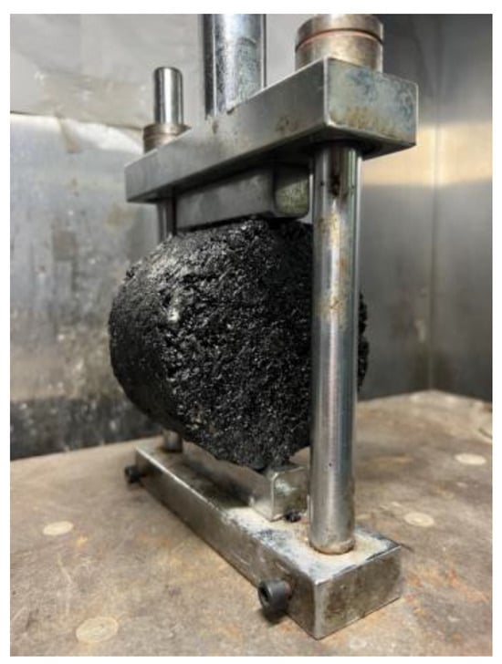 The immersion Marshall test and freeze–thaw splitting test are usually used to evaluate the water stability of asphalt pavement. The freeze–thaw splitting test was conducted in this study as it simulates the actual environment of asphalt pavement well, using vacuum saturation, freeze–thaw cycle, and a high-temperature water bath. Eight mixture specimens were prepared based on the optimum asphalt-to-aggregate ratio (7.1%) and compacted 50 times on each side. They were randomly divided into two groups with 4 specimens in each group. The first group was subjected to a freeze–thaw cycle, while the second group was saturated by the standard water saturation test method and then placed in a plastic bag with about 10 mL water. The bag was then sealed and placed in a refrigerator at −18 °C for 16 h. After that, the specimens were taken out and placed in a thermostatic water tank at 60 °C. The plastic bag was removed and the specimens were kept in 60 °C water for 24 h. Then, the two groups of specimens were immersed in a water tank at a constant 25 °C for 2 h. The specimens were taken out and subjected to splitting tests in sequence. The maximum loads before failure were recorded. The freeze–thaw splitting tensile strength ratio (TSR) was calculated according to Equation (6):