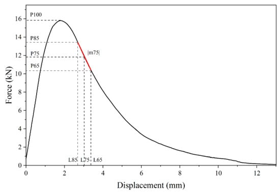 where is the indirect tensile strength (MPa); D is the diameter of the specimen (mm); t is the thickness of the specimen (mm); P100 is the maximum load (kN); is the modulus index of the cracked specimen (kN/mm); P85 is the 5% maximum load (kN); P65 is the 65% maximum load (kN); l85 is the displacement value corresponding to 85% maximum load after the peak (mm); l65 is the displacement value corresponding to 65% of the maximum load after the peak (mm); Gf is the fracture energy density (J/mm2); Wf is the fracture work, i.e., the area beneath the load–displacement curve (J); l75 is the displacement value corresponding to 75% of the maximum load after the peak (mm).