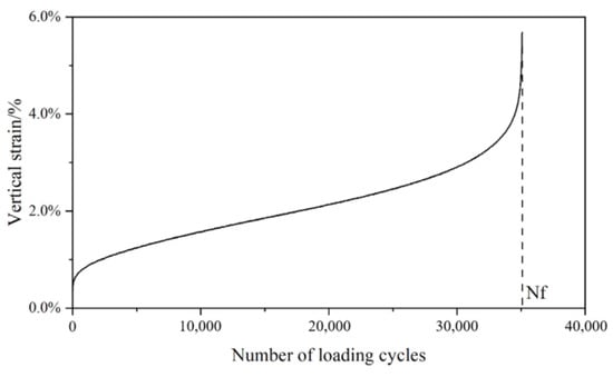 As shown in Figure 7, in the process of the indirect tensile fatigue test, the fatigue curve of vertical strain generally presents three-stage characteristics. In the first stage, the vertical strain increases sharply under repeated load, and an initial crack begins to appear at the end of this stage. In the second stage, the fatigue curve shows a linear increase with load cycles, indicating constant development of micro-cracks. In the third stage, the vertical strain increases exponentially until the fatigue failure of the specimens. Fatigue life (Nf) can be defined as the total number of load cycles applied to the asphalt mixture before fatigue failure.