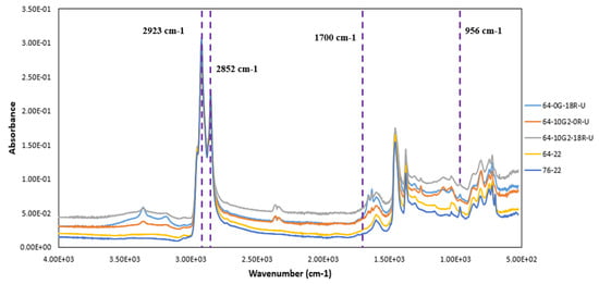A study was conducted on the modification mechanisms of rock asphalt and devulcanized rubber []. Fourier transform infrared (FTIR) spectroscopy tests were performed on single rock asphalt-modified asphalt, single rubber-modified asphalt, and devulcanized rubber–rock asphalt composite-modified asphalt, as shown in Figure 8. The infrared spectra of the composite-modified asphalt made from devulcanized rubber and rock asphalt did not exhibit any new peaks compared to the single modified asphalts, indicating that the mixing of devulcanized rubber, rock asphalt, and base asphalt is a physical process without chemical reactions. The distinct peak observed at 956 cm−1 in SBS-modified asphalt relative to PG 64-22 base asphalt is associated with the bending vibration in the butadiene double bond. Butadiene is a component of styrene–butadiene–styrene (SBS) copolymers, which are commonly used as modifiers in asphalt to improve its properties. The presence of a peak at this wavelength in modified asphalt containing devulcanized rubber suggests that the devulcanized rubber contains components similar to butadiene in SBS. This indicates that the devulcanized rubber may have some chemical similarity to SBS, which could contribute to similar properties in the modified asphalt. The infrared spectra of the composite-modified asphalt made from devulcanized rubber and rock asphalt did not exhibit any new peaks compared to the single modified asphalts. This suggests that the mixing of devulcanized rubber, rock asphalt, and base asphalt is a physical process without chemical reactions. In other words, the components are blended together without altering their chemical structures [].