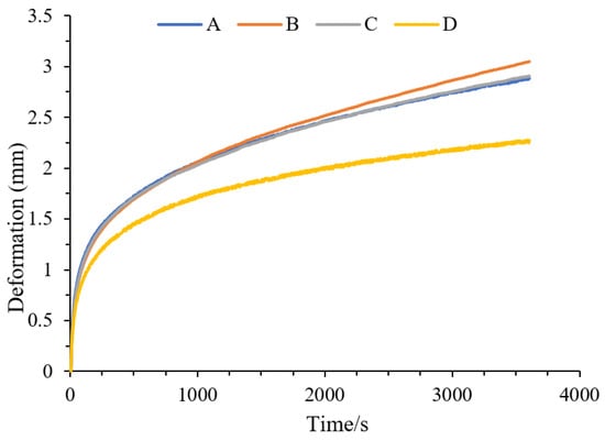 To compare the effects of the wet and dry processing methods and determine the proper content of rock asphalt, four groups of specimens were prepared as shown in Table 9. The dry processing method consisted in heating the aggregate first and then sequentially adding and blending the modifiers, base asphalt, and the mineral powder for 90 s at 170 °C. The wet processing method consisted in preparing the modified asphalt in advance, and, in this case, the base asphalt was first heated with desulfurization rubber for 60 min at 180 °C to allow for solvent swelling, and then rock asphalt was also added and heated for another 60 min at 180 °C. High-speed shearing mixers were then used for blending at 5000 rpm and 180 °C for 45 min. It should be noted that in the process of high-speed blending, the temperature may be elevated due to the friction heat, and the blending temperature was monitored by an infrared thermometer to ensure that the temperature is within the requirements. Finally, the modified asphalt was mixed with aggregates to produce asphalt mixtures. As shown in the table, Group A was prepared by the wet processing method and Groups B, C, and D were prepared by the dry processing method.