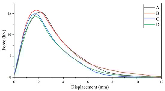 Asphalt mixtures have higher modulus at low temperatures and may be subjected to brittle failure. Under the effect of vehicle loads and reflection cracks from the semi-rigid base, cracks may develop on the pavement surface, forming bottom–up cracks or top–bottom cracks. The cracks may reduce the strength of the pavement and induce other pavement distresses like water damage. Therefore, the cracking resistance of asphalt mixtures at low temperatures was evaluated in this study by the low-temperature bending test []. The tests were conducted as per Highway Engineering Asphalt and Asphalt Mixture Test Procedures (JTG E20-2011). The rutting plates were prepared according to the optimum asphalt-to-aggregate ratio of 7.1%, and the rutting plates were cut into small specimens with a dimension of 250 mm × 30 mm × 35 mm. At least 6 parallel specimens were prepared for each test group. The prismatic beam was placed in a low-temperature oven at −10 °C for more than 4 h, and then the specimens were loaded at a rate of 50 mm/min until specimen failure.