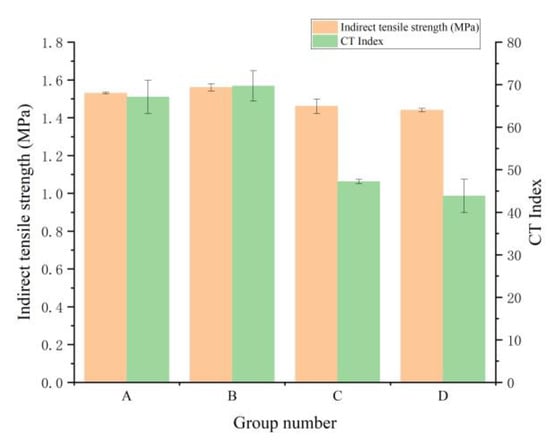 The relationship between TSR and the dosage of desulfurized rubber powder is evident from the declining TSR values (97.18% > 90.99% > 87.46%) as the rubber content increases (Group B < Group C < Group D). This trend reinforces the notion that increased rubber dosage weakens asphalt mixtures’ water stability by potentially enhancing porosity, facilitating water intrusion and compromising asphalt–aggregate adhesion.