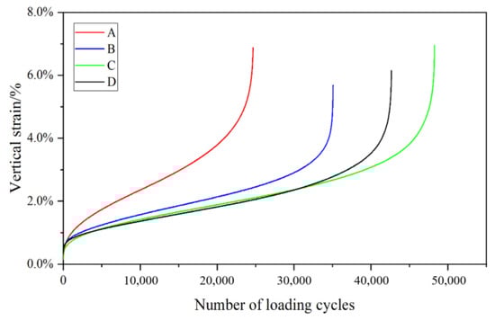 The fatigue curves from indirect tensile tests on the mixture specimens are shown in Figure 15. The vertical strain curves of asphalt mixtures in the indirect tensile fatigue test exhibit a typical three-stage characteristic. In the first stage, the vertical strain increases sharply under cyclic loading, indicating the initiation of damage accumulation and the formation of initial cracks within the material. The second stage is characterized by a linear growth trend in the fatigue curve, where the development rate of micro-cracks remains constant, reflecting the material’s stability under continuous loading. In the third stage, the vertical strain accelerates rapidly, growing exponentially, until the sample undergoes fatigue failure, signifying that the material can no longer withstand further loading [].