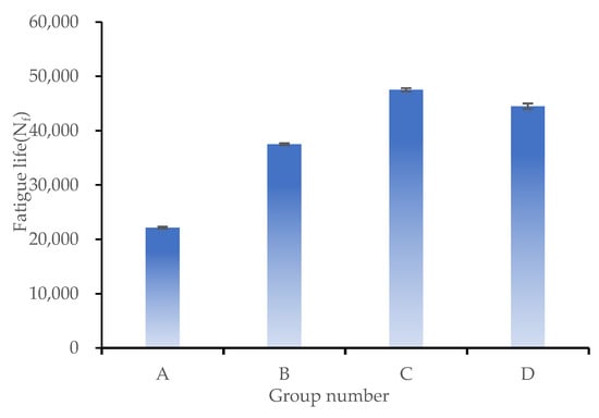 Table 14 visually presents the fatigue life (Nf) of different sample groups. Group A has the lowest fatigue life (21,449 cycles), indicating the poorest fatigue resistance. Group C has the highest fatigue life (48,257 cycles), indicating the best fatigue resistance. Groups B and D are intermediate, but Group B is slightly higher than Group D. Group A has the largest coefficient of variation (21.68%), indicating the highest data dispersion and poor stability. Group C has the smallest coefficient of variation (2.06%), indicating the most stable data and good repeatability.